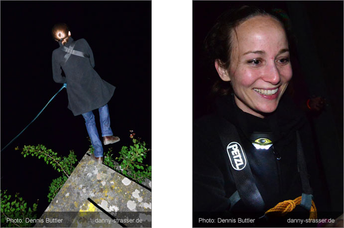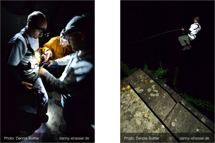 Seppm attaches the 100 feet rope to his brother Schorsch so that he can dash down. |