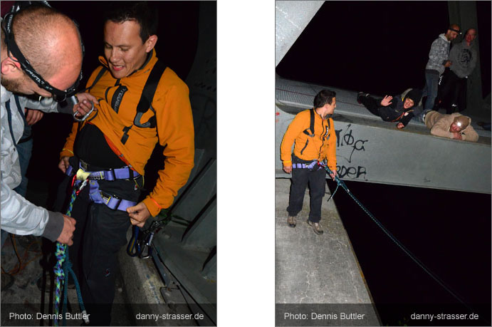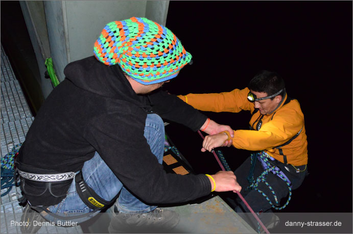 Seppm attaches the 100 feet rope to his brother Schorsch so that he can dash down. |